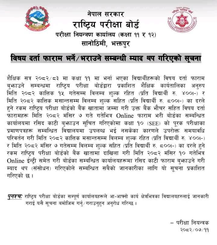 भक्तपुर, कार्तिक ११ गते । राष्ट्रिय परीक्षा बोर्ड, परीक्षा नियन्त्रण कार्यालय (कक्षा ११ र १२) सानोठिमी, भक्तपुरले शैक्षिक सत्र २०८२/८३ मा कक्षा ११ मा भर्ना भएका विद्यार्थीहरूको विषय दर्ता फारम बुझाउने म्याद थप गरेको छ।
