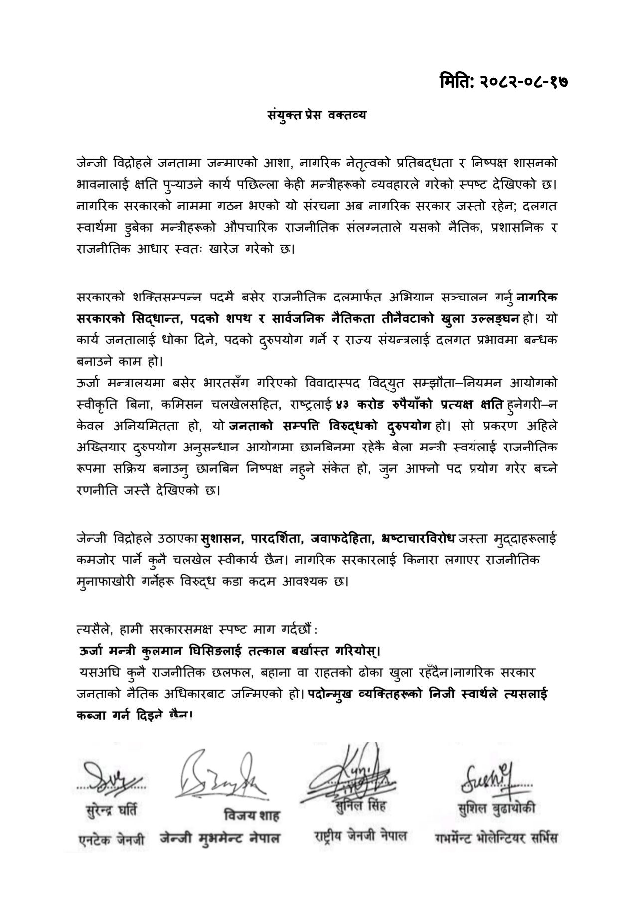 जेन जि सम्बद्ध चार समूहको आरोप : ‘नागरिक सरकार नैतिक धरातलबाट चिप्लियो, ऊर्जा मन्त्री घिसिङलाई तुरुन्त बर्खास्त गरियोस्’