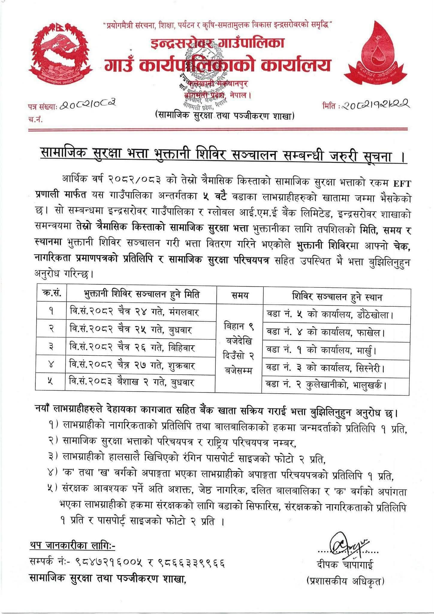 गाउँपालिका र ग्लोबल आईएमई बैंक लिमिटेड, इन्द्रसरोवर शाखाको समन्वयमा सञ्चालन हुने उक्त शिविर मार्फत लाभग्राहीहरूलाई आफ्नै वडामा पुगेर भत्ता वितरण गरिने व्यवस्था मिलाइएको छ। सम्बन्धित लाभग्राहीहरूलाई तोकिएको मिति, समय र स्थानमा उपस्थित भई भत्ता बुझ्न आग्रह गरिएको छ।