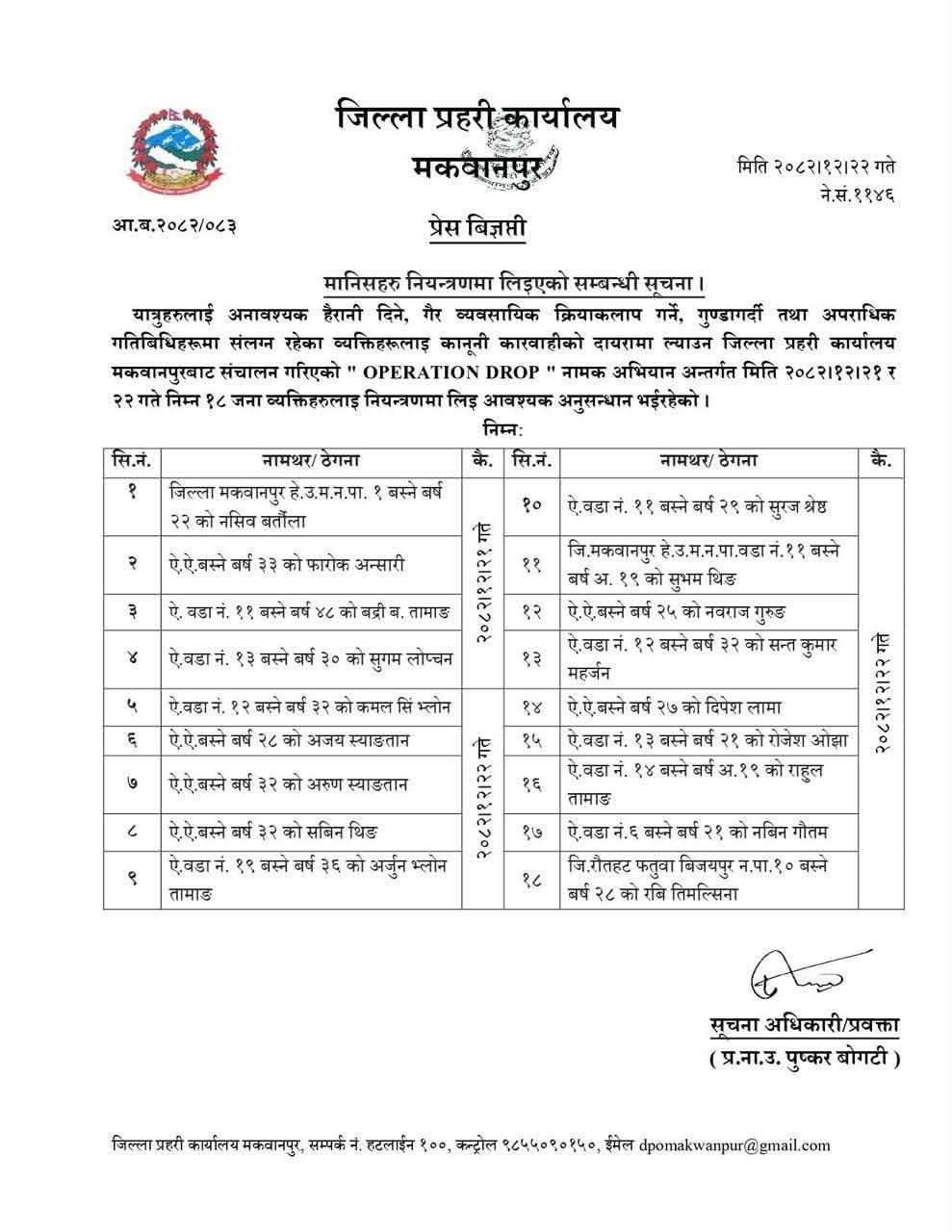 जिल्ला प्रहरी मकवानपुरद्वारा जारी सूचना हेर्नुहोस्।