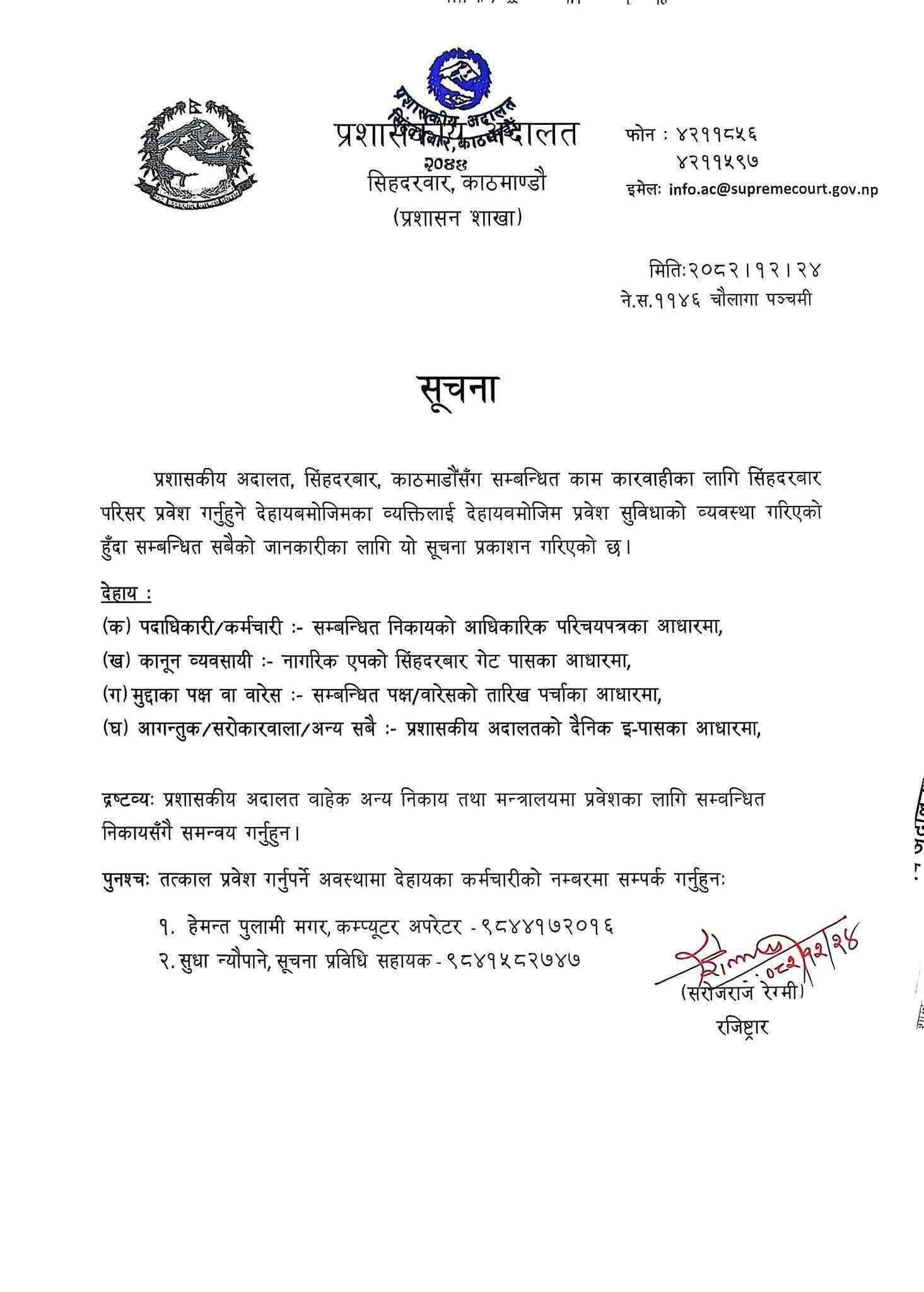 प्रशासकीय अदालतद्वारा जारी सूचना यस्तो छ हेर्नुहोस्।