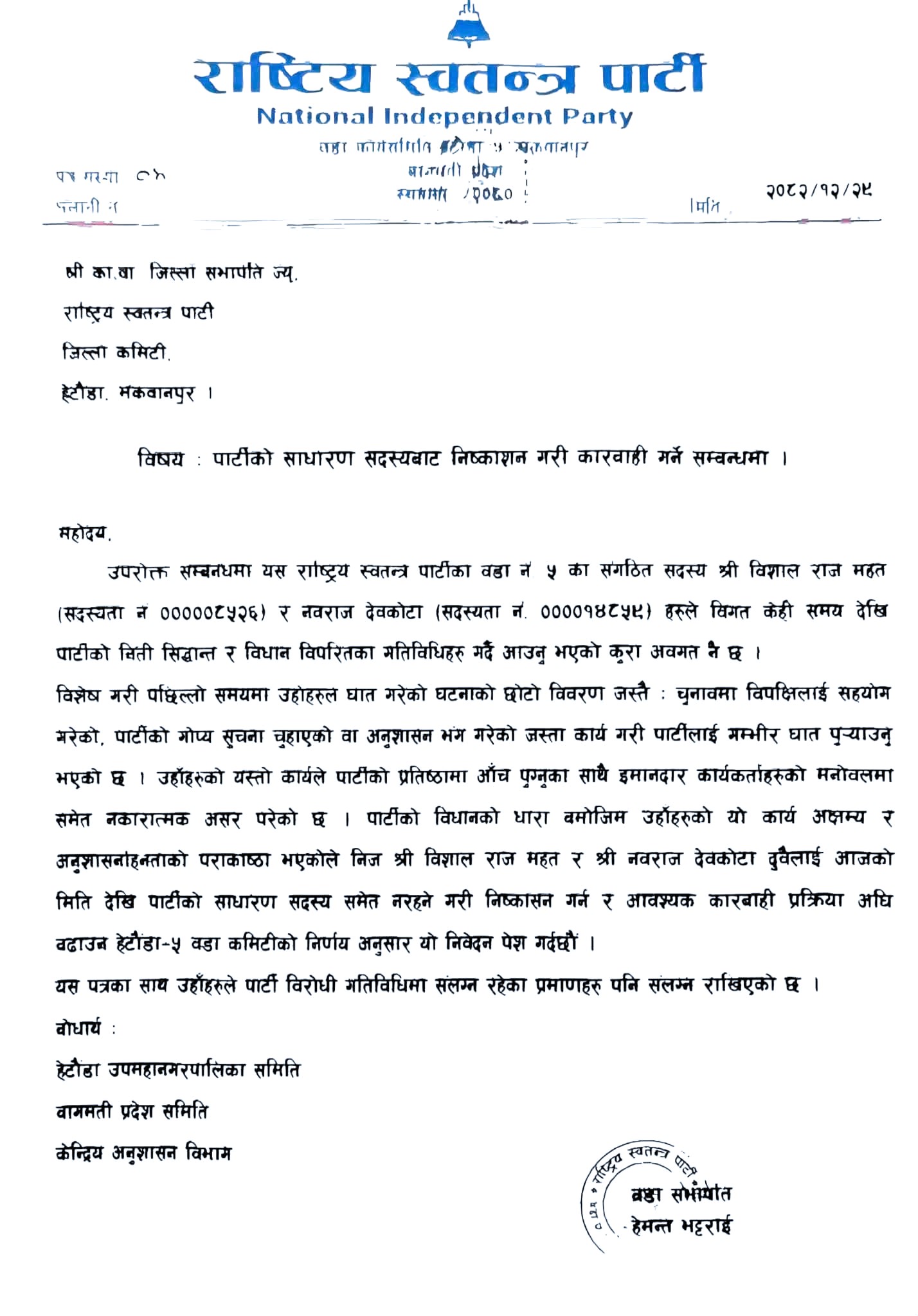 अझ रोचक कुरा के छ भने, एकातिर सम्मानित महतलाई सम्भावित भावी मेयरका रूपमा हेरिँदै आएको छ भने अर्कोतिर आफ्नै राजनीतिक वृत्तबाट कारबाहीको सिफारिस हुनु विरोधाभासपूर्ण देखिएको छ।