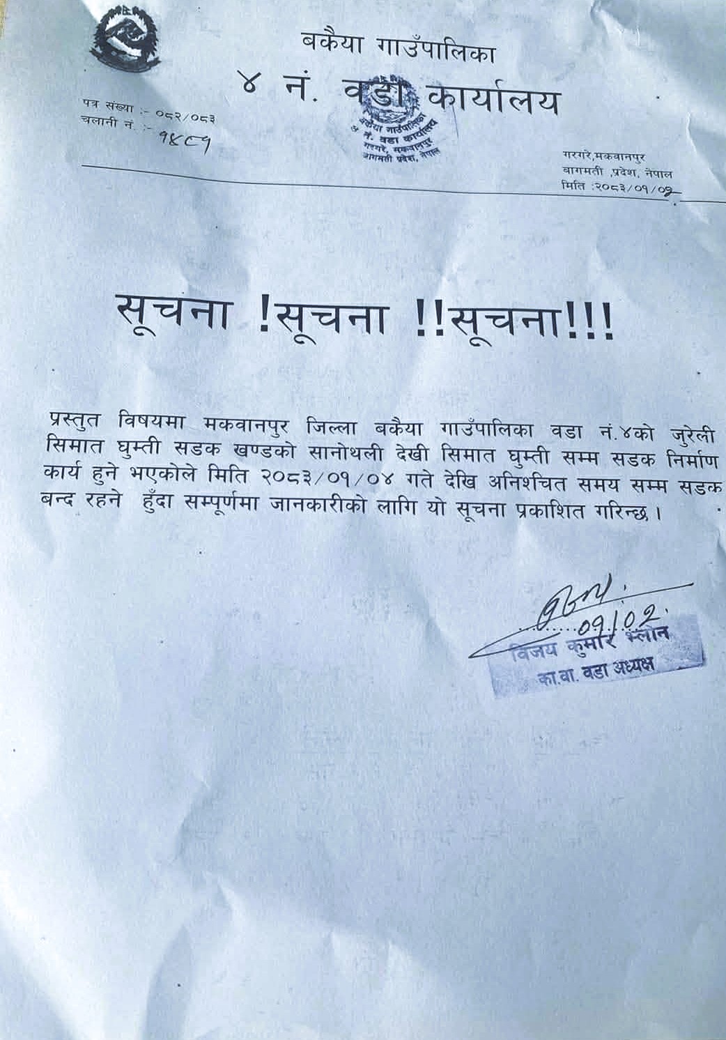 वडा कार्यालयले यात्रु तथा स्थानीय बासिन्दालाई वैकल्पिक मार्ग प्रयोग गर्न अनुरोध गर्दै निर्माण कार्यको अवधिभर सहकार्य र सहयोगका लागि अपिल गरेको छ।