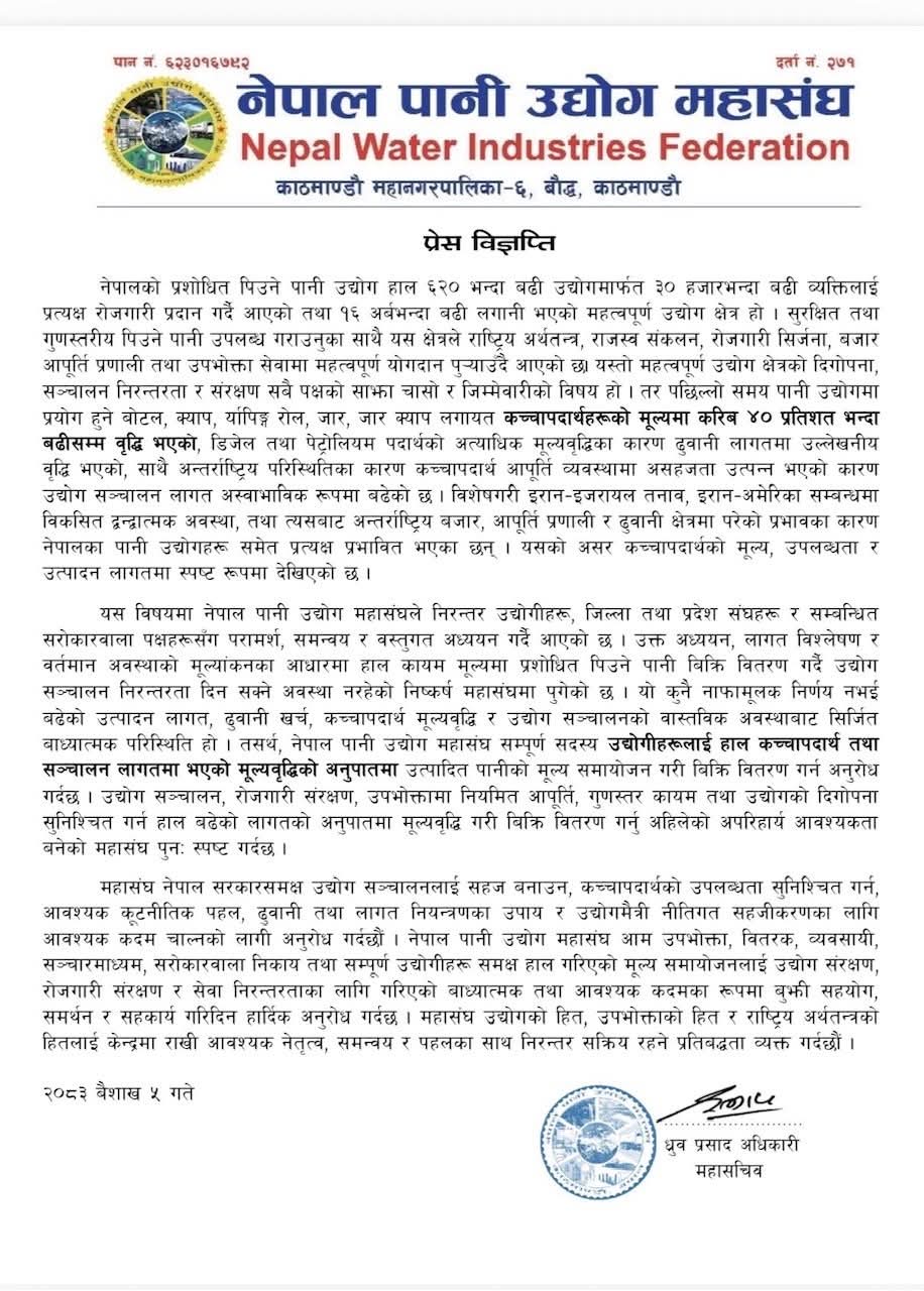 महासङ्घले मूल्य समायोजनलाई नाफामूलक निर्णय नभई बाध्यात्मक कदमका रूपमा व्याख्या गर्दै सदस्य उद्योगहरूलाई कच्चापदार्थ तथा सञ्चालन लागत वृद्धि अनुसार पानीको मूल्य समायोजन गर्न अनुरोध गरेको छ। उद्योग सञ्चालन, रोजगारी संरक्षण, उपभोक्तामा नियमित आपूर्ति र गुणस्तर कायम राख्न मूल्य समायोजन अपरिहार्य भएको महासङ्घले स्पष्ट पारेको छ।