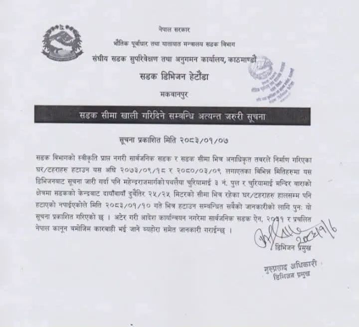 सूचनाअनुसार महेन्द्र राजमार्गको पथलैया, चुरियामाई ३ नम्बर पुल र चुरियामाई मन्दिर क्षेत्र आसपास सडकको केन्द्रबाट दायाँ–बायाँ २५/२५ मिटर भित्र पर्ने सम्पूर्ण अनधिकृत संरचना २०८३ साल वैशाख १० गतेभित्र अनिवार्य रूपमा हटाउन निर्देशन दिइएको छ।