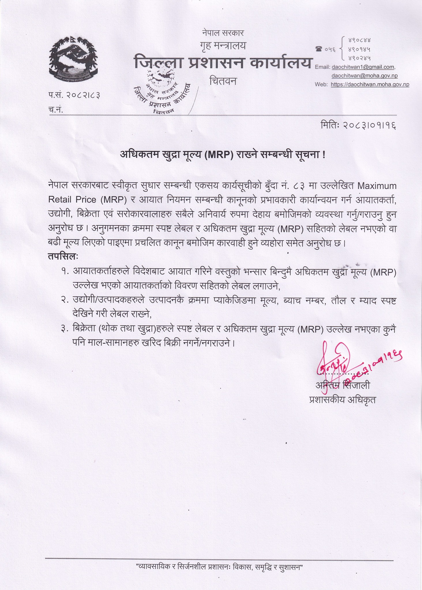 चितवन प्रशासनद्वारा एमआरपी अनिवार्य गर्ने निर्देशन, उल्लंघनमा कारबाही हुने चेतावनी