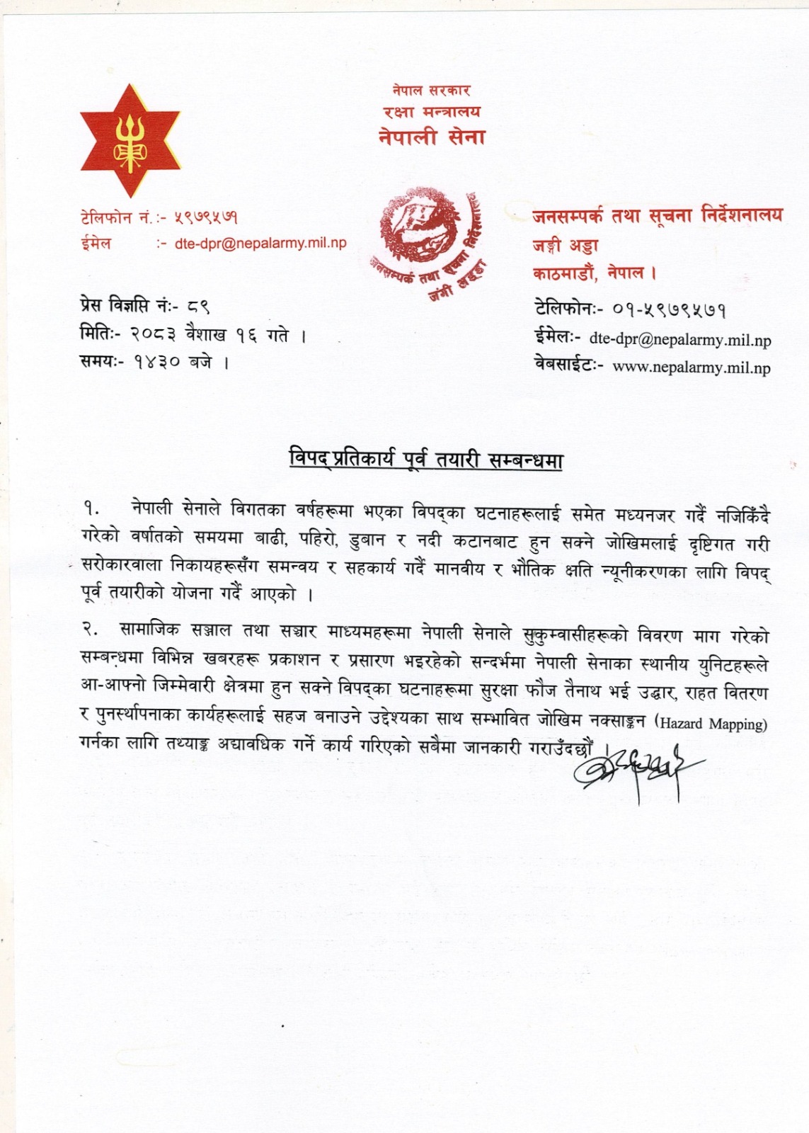काठमाडौं,बैशाख १६ गते । नेपाली सेनाले आगामी बर्सातको समयमा हुनसक्ने बाढी, पहिरो, डुबान तथा नदी कटान जस्ता विपद्का जोखिमलाई मध्यनजर गर्दै पूर्व तयारीलाई तीव्र बनाएको जनाएको छ। नेपाली सेना जन सम्पर्क तथा सूचना निर्देशनालय, जङ्गी अड्डाले जारी गरेको प्रेस विज्ञप्तिमा विगतका विपद्का अनुभवलाई आधार बनाएर सम्भावित क्षति न्यूनीकरणका लागि सरोकारवाला निकायसँग समन्वय र सहकार्य गर्दै योजना निर्माण भइरहेको उल्लेख गरिएको छ।