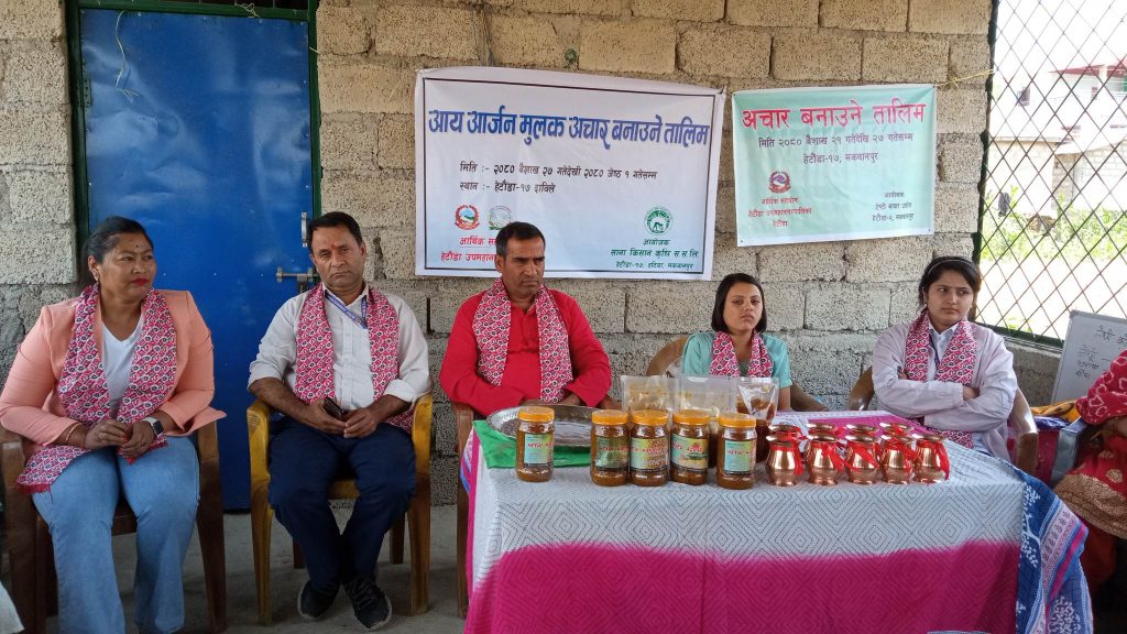 साना किसान कृषि सहकारीको आयोजना तथा हेटौंडा उपमहानगरपालिकाको आर्थिक सहयोगमा आज देखि जेष्ठ १ गते सम्म सोही स्थानमा आय आर्जन मुलक अचार बनाउने ५ दिने तालिम पनि सुरु भएको छ।