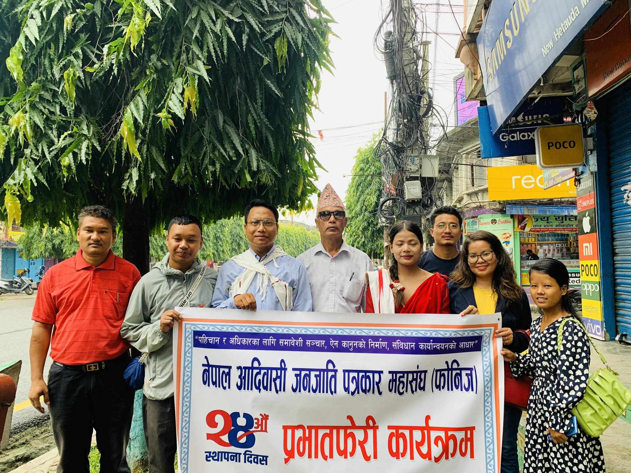 हेटौंडा । नेपाल आदिवासी जनजाति पत्रकार महासंघं(फोनिज) मकवानपुर शाखाले शनिबार बिहान प्रभातफेरी कार्यक्रमको अयोजना गर्दै फोनिजको स्थापना दिवस मनाएको छ । बागमती प्रदेशको राजधानी हेटौंडाको मुख्यचोक सिमाचोकबाट उद्योग वाणिज्य संघ मकवानपुरसम्म प्रभातफेरी कार्यक्रमको अयोजना गर्दै फोनिजको २४ औं स्थापना दिवस मनाएको हो ।
