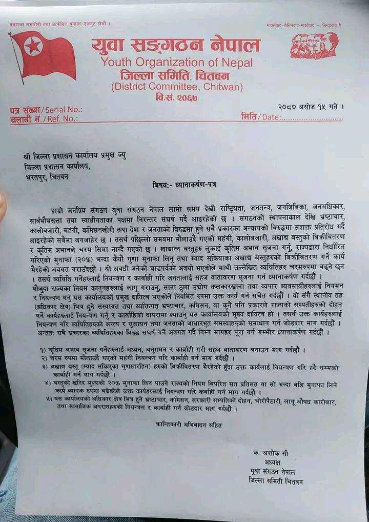 हेटौंडा । युवा सङ्गठन नेपाल, जिल्ला समिति, चितवनले सोमबार जिल्ला प्रशासन कार्यालय, भरतपुर, चितवनलाई  ध्यानाकर्षण पत्र बुझाएको छ । त्यसै गरि ५ वटा जिल्लामा पनि युवा सङ्गठन नेपाल ध्यानाकर्षण गराएकाे सारा जीवी तथा उत्पीडित युवाहरु एकजुट हो ।मार्क्सवाद-लेनिनवाद वा जिन्दाबाद भन्दै ५ बुँदे ध्यानाकर्षण पत्र बुझाएको छ । पछिल्लो समयमा मौलाउदै गएको महंगी, कालोबजारी, अखाद्य बस्तुको बिक्रीबितरण र कृतिम अभावले चरम सिमा नाग्दै गएको छ । खाद्यान्न वस्तुहरु लुकाई कृतिम अभाव सृजना गर्नु, राज्यद्वारा निर्धारित गरिएको मुनाफा (२०%) भन्दा कैयौं गुणा मुनाफा लिनु तथा म्याद सकियाका अखाद्य वस्तुहरुको बिक्रीवितरण गर्ने कार्य भैरहेको अवगत गराउँदछौं भन्दै ध्यानाकर्षण गराएको छ । यो अवधी भनेको चाडपर्वको अवधी भएकोले माथी उल्लेखित वेथितिहरु चरमरुपमा बढ्ने छन । तसर्थ वेथिति गर्नेहरुलाई नियन्त्रण र कार्बाही गरि जनतालाई सहज वातावरण सृजना गर्न ध्यानाकर्षण गर्दछौं भनिएको छ ।मौजद राज्यका नियम कानुनहरुलाई लागू गराउनु, साना ठुला उद्योग कलकारखाना तथा व्यपार व्यवसायीहरुलाई नियमन र नियन्त्रण गर्नु यस कार्यालयको प्रमुख दायित्व भएकोले नियमित रुपमा उक्त कार्य गर्न सचेत गर्दछौं । यो संगै स्थानीय तह (अधिकार क्षेत्र) भित्र हुने संस्थागत तथा व्यक्तिगत भ्रष्टाचार, कमिसन, वा कुनै पनि प्रकारले राज्यको सम्पतीहरुको दोहन गर्ने कार्यहरुलाई नियन्त्रण गर्नु र कार्बाहिको दायरामा ल्याउनु यस कार्यालयको मुख्य दायित्व हो । तसर्थ उक्त कार्यहरुलाई नियन्त्रण गरि व्यधितिहरुको अन्त्य र सुसासन तथा जनताको आधारभुत समस्याहरुको समाधान गर्न जोडदार माग गर्दछौं । अन्ततः सबै प्रकारका व्यथितिहरुका विरुद्ध संघर्ष गर्ने अवगत गर्दै निम्न मागहरु पूरा गर्न गम्भीर ध्यानाकर्षण गर्दछौं भन्दै ध्यानाकर्षण पत्र बुझाएको छ ।